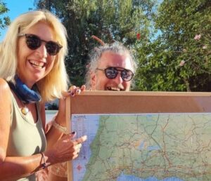 Deze week hadden we een paar hilarische gasten die als ware stand-upcomedians de sfeer bepaalden. De ene scherpe opmerking volgde de andere in een razendsnel tempo. Toen ik terloops het woord “stand-upcomedian” liet vallen, riep iemand spontaan: “Eerder een sit-down comedian!” Iedereen barstte in lachen uit. Ik was net bezig met een uitleg over een mooie route langs de Costa Vicentina aan de westkust van de Algarve. Maar voordat ik er erg in had, ontstond er een spontaan mini-theaterspel achter het bord! En wel door de creatieve uitbater van ‘t gezellig kunst-, drank- en eetcafé ‘t Hof schuurke. Mijn uitleg werd compleet overstemd door het gelach. Zelfs ik kon mijn lach niet inhouden. Tja, lachen is écht gezond!